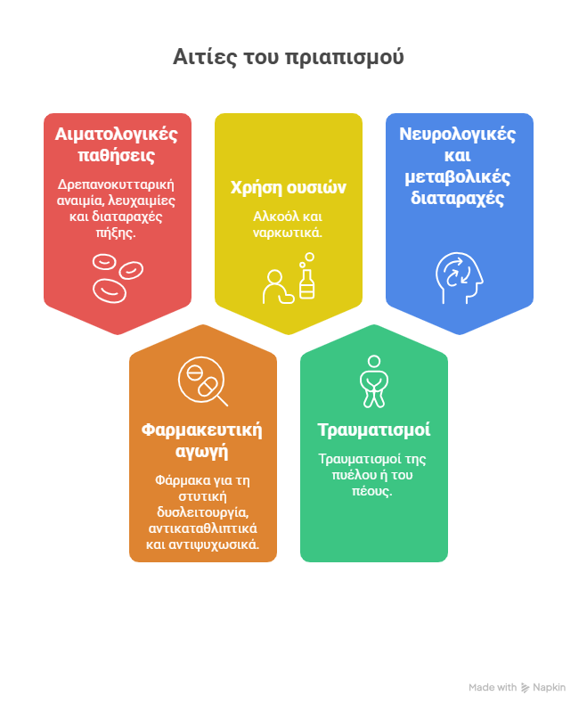Τα αίτια του πριαπισμού είναι πολυάριθμα και συχνά σχετίζονται με καταστάσεις που επηρεάζουν τη ροή ή τη σύσταση του αίματος. Πιο βασικά εξ αυτών είναι τα κάτωθι: